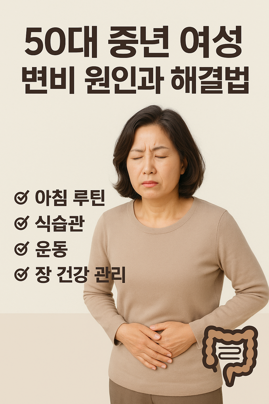 50대 중년 여성에게 흔한 변비, 원인부터 생활습관 개선법까지 한눈에 정리했습니다. 아침 루틴, 식습관, 운동, 장 건강 관리로 변비를 효과적으로 예방하세요.