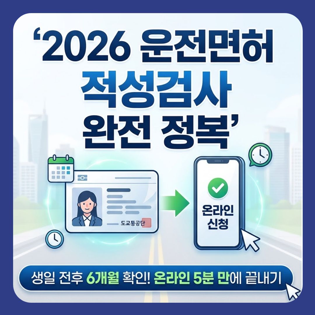 2026년 개정된 생일 기준 운전면허 적성검사 기간과 온라인 접수 방법을 상세히 설명합니다. 1종 보통 및 2종 면허 대상자가 건강검진 내역 활용으로 방문 없이 갱신하는 꿀팁과 과태료 방지 대책을 지금 바로 확인하세요.